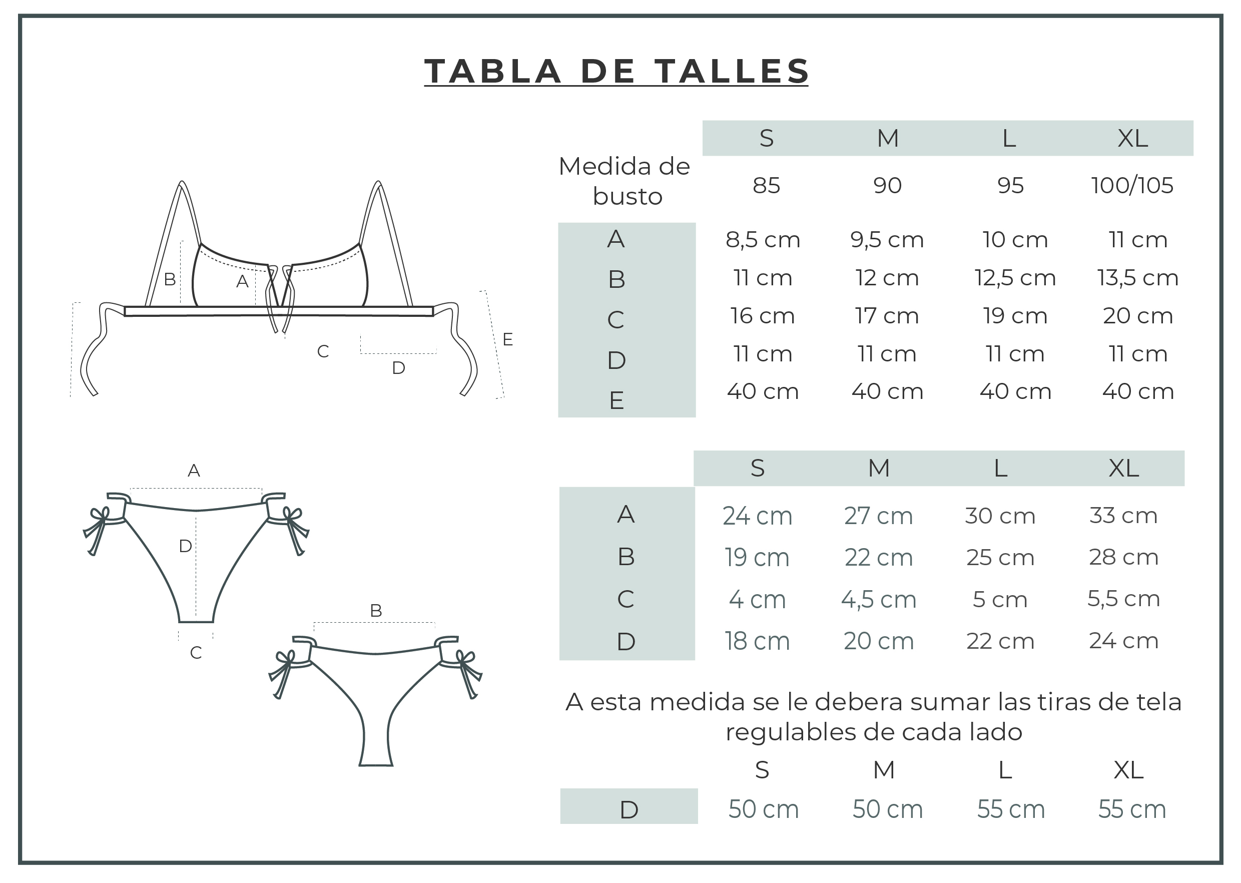 El corpiño posee tirantes de tela en hombros y espalda para atar. Posibilidad de atar en el centro y regular apertura del frente.