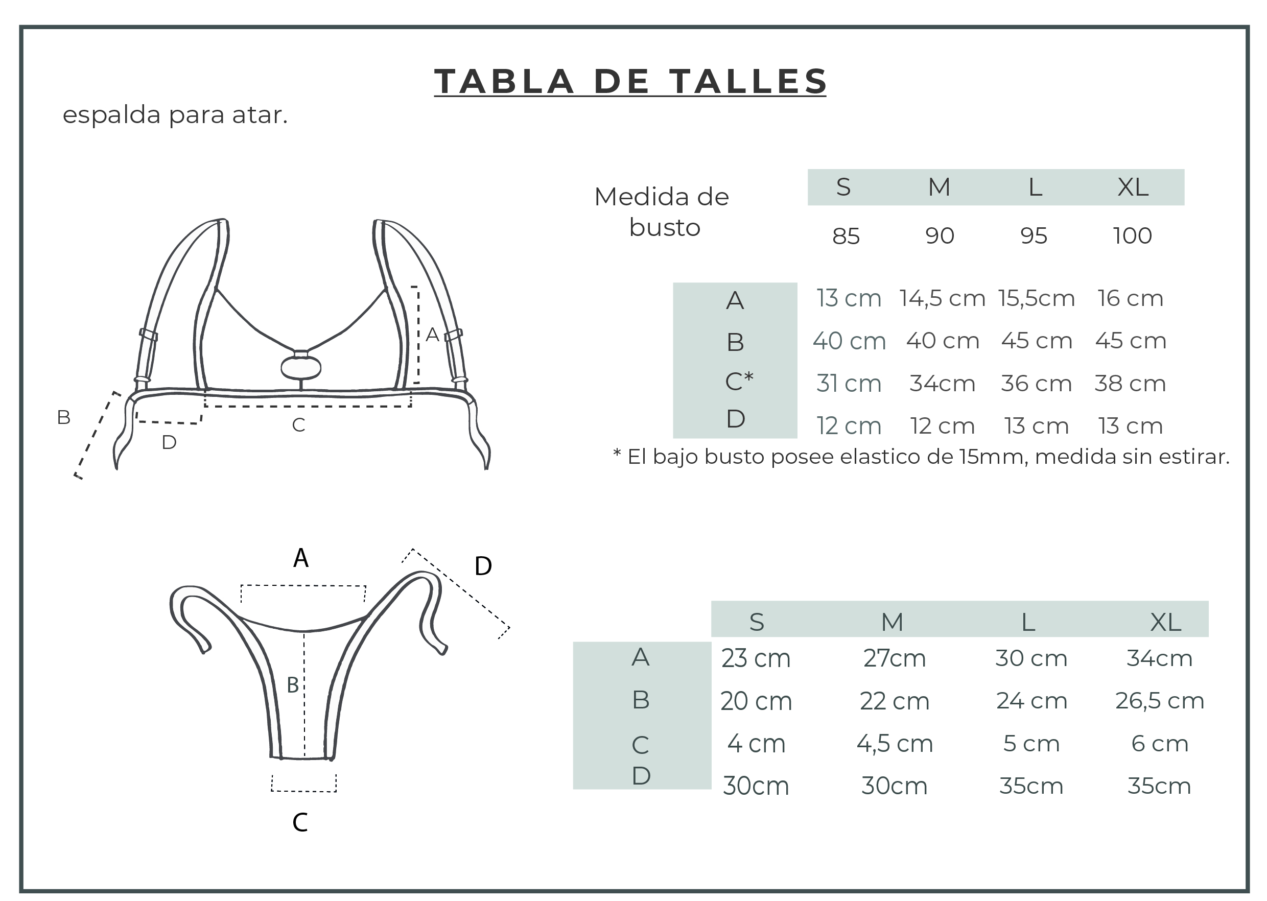 Corpiño con breteles regulables y contorno de bajo busto con elastico de 15mm para mejor sujeción. Las tiras de los hombros son de 10mm y la espalda para atar, con forreria del lado interno.